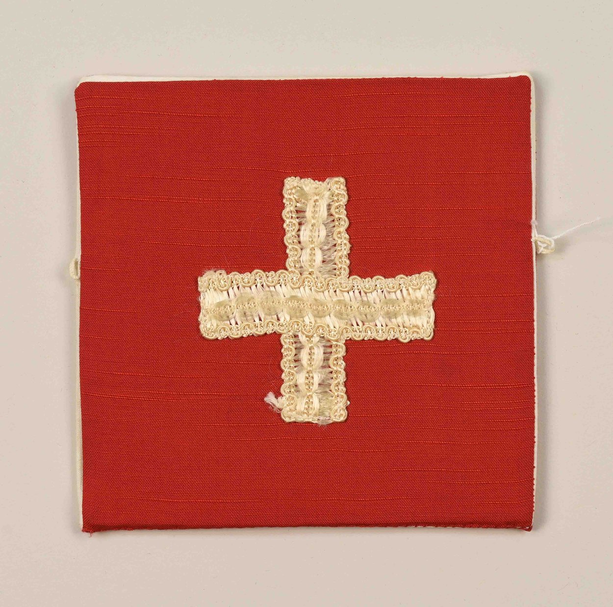 Rode speelgoedbeurs met een wit kruisje van wit sierband