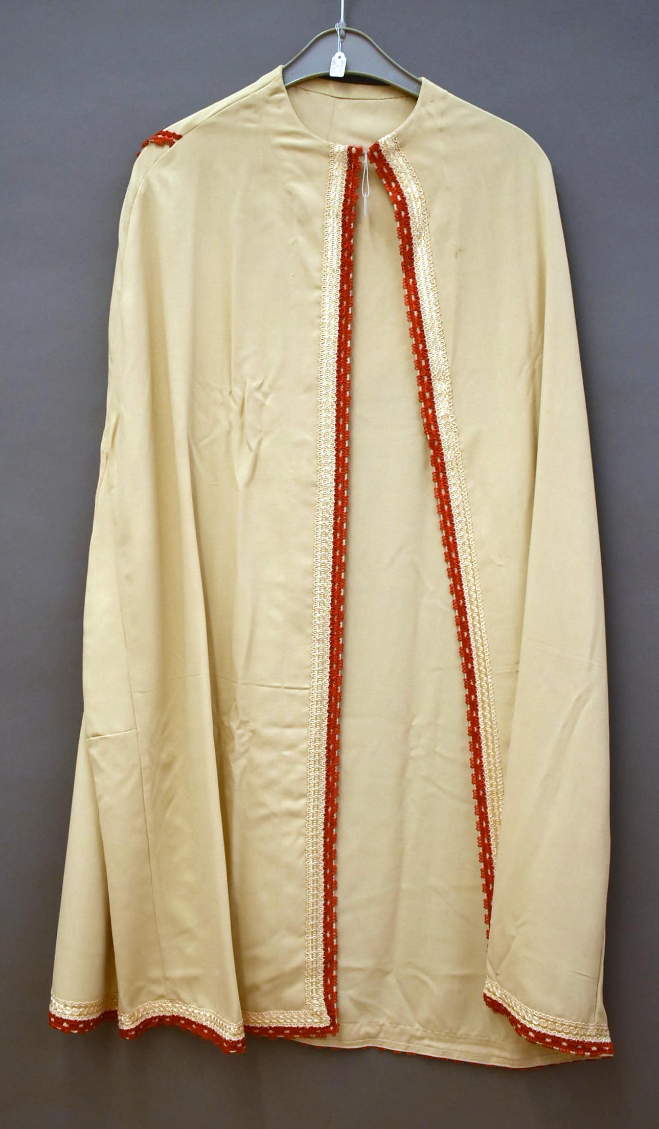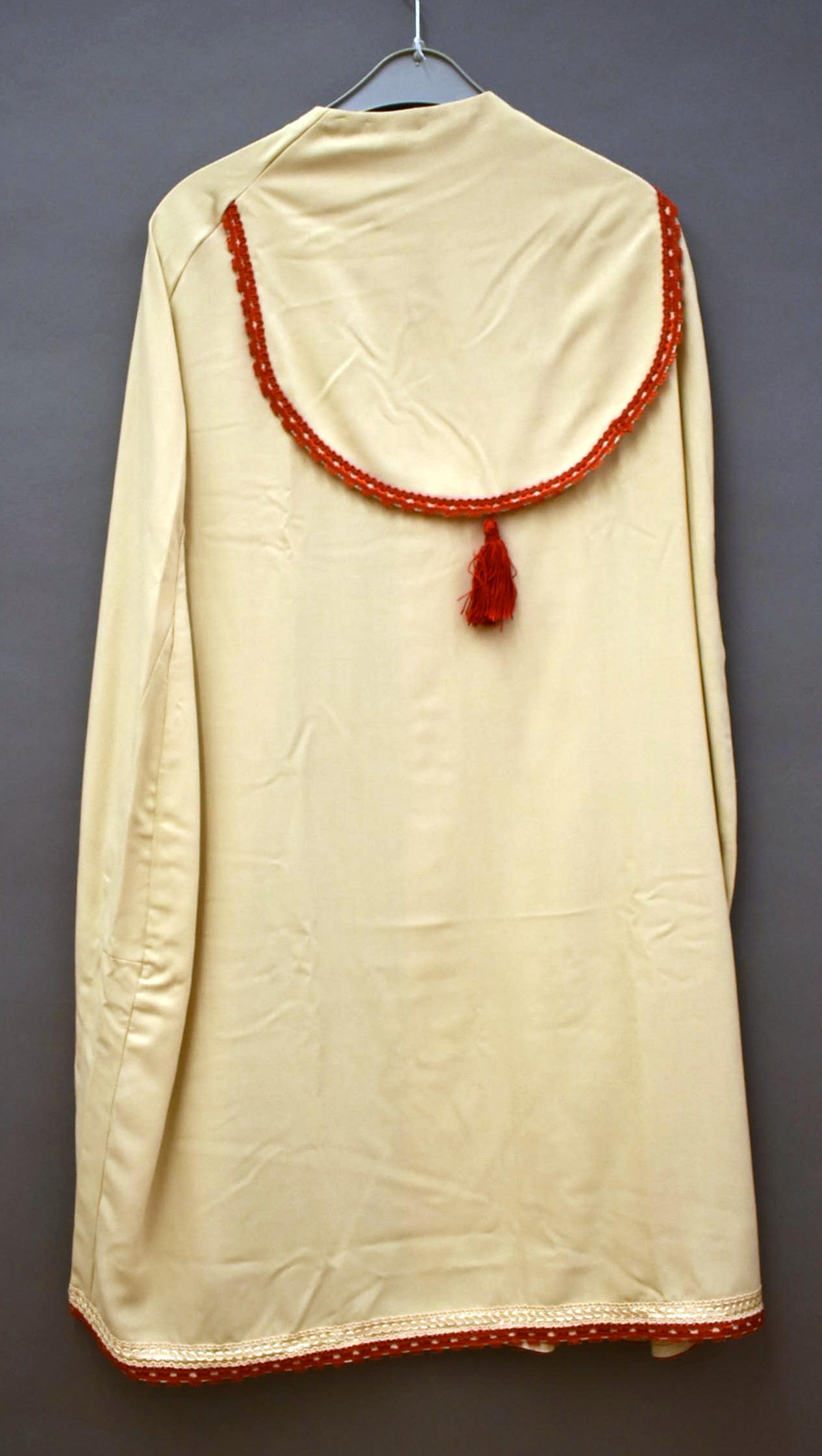 Witte kinderkoorkap met witte en rode sierband langs boorden en rugschild