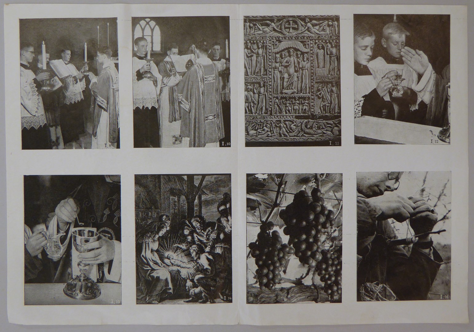 Blad met acht foto's van de katholieke eredienst genummerd I.9 tot en met I.16
