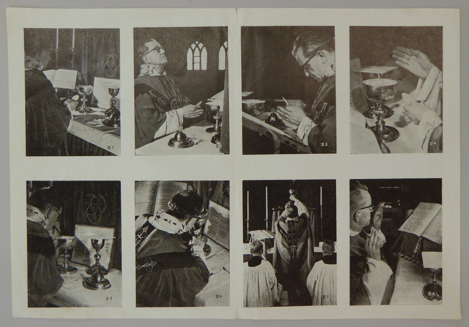 Blad met acht foto's van de katholieke eredienst genummerd II.1 tot en met II.8
