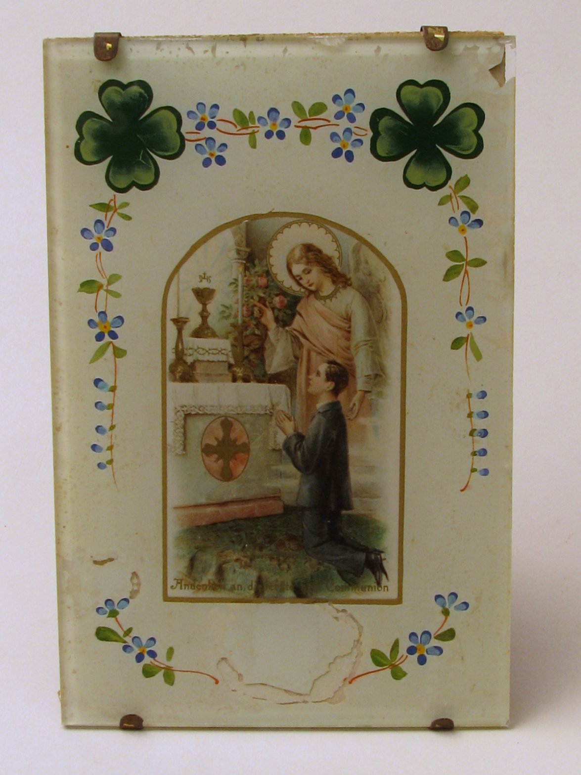 Prent met engel en jongen voor een altaar met kelk, kandelaars en stralende hostie
