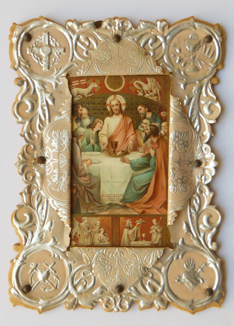 Prent in opengevouwen kunststof lijst met voorstelling laatste avondmaal