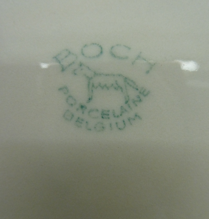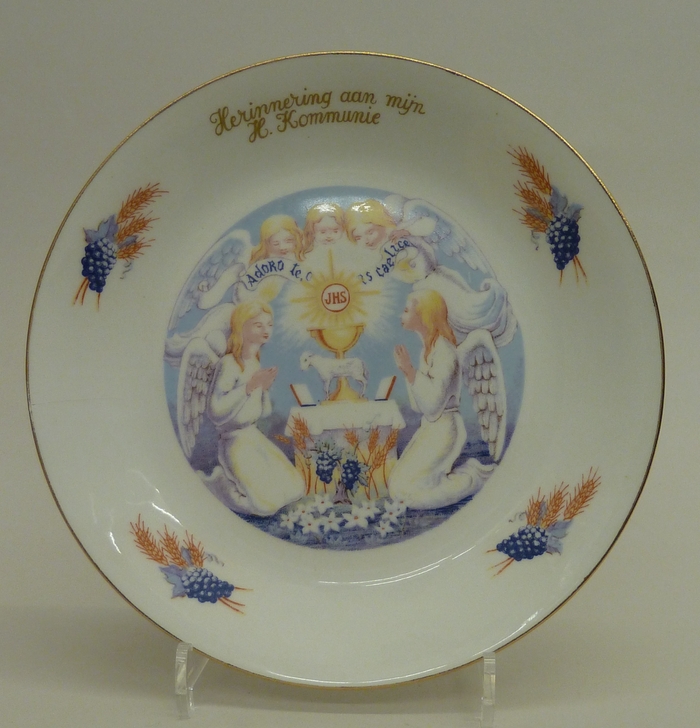 Ontbijtbord met kelk, hostie, lam en canonborden op altaar, rondom engelen, met "... H. Kommunie"
