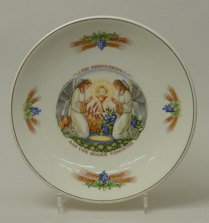 Wandbord met kelk, hostie, korenaren en druiven en twee engelen, met "Ter herinnering ... communie"