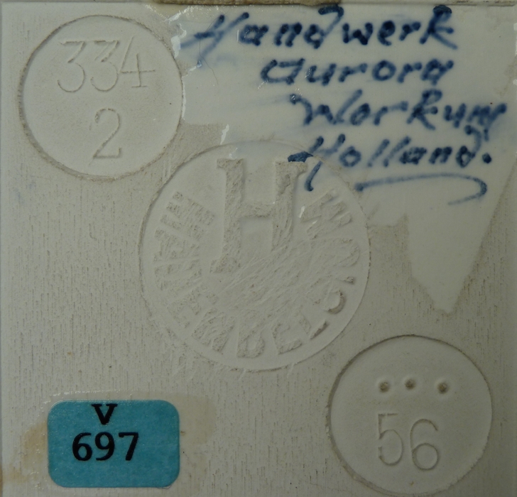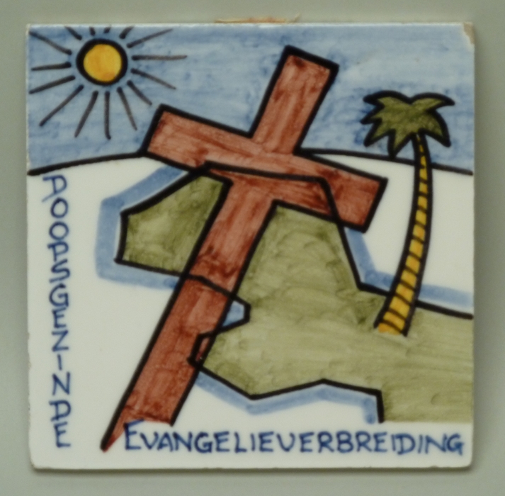 Wandtegel met gestileerde hand, kruis, zon en palmboom met "Doopsgezinde Evangelieverbreiding"