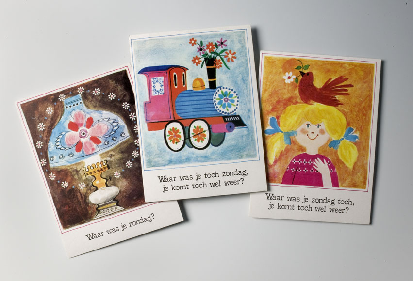 Zondagsschoolmateriaal: absentiekaart waarop trein, met "Waar was je toch zondag, je komt toch wel weer?"