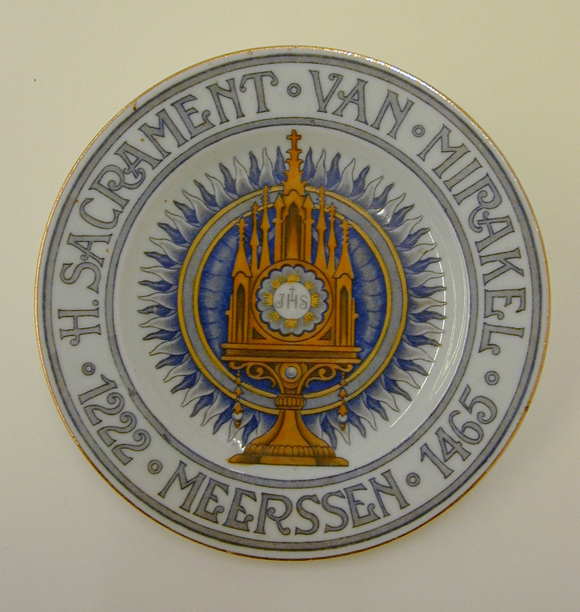 Herdenkingsbord met monstrans met hostie en "H. Sacrament van Mirakel 1222 Meerssen 1465"