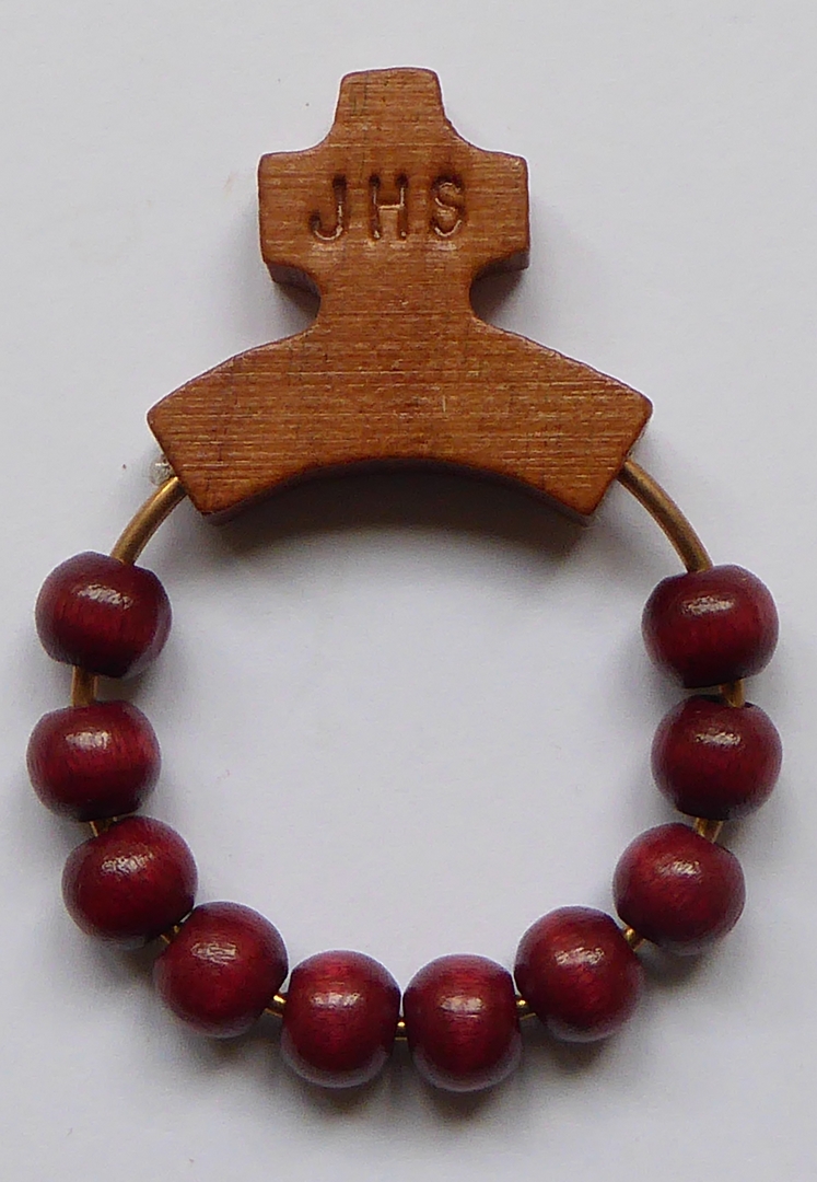 Vingerrozenkrans, rode houten kralen op koperen boogje met houten kruisje met JHS