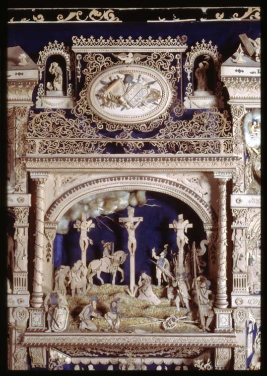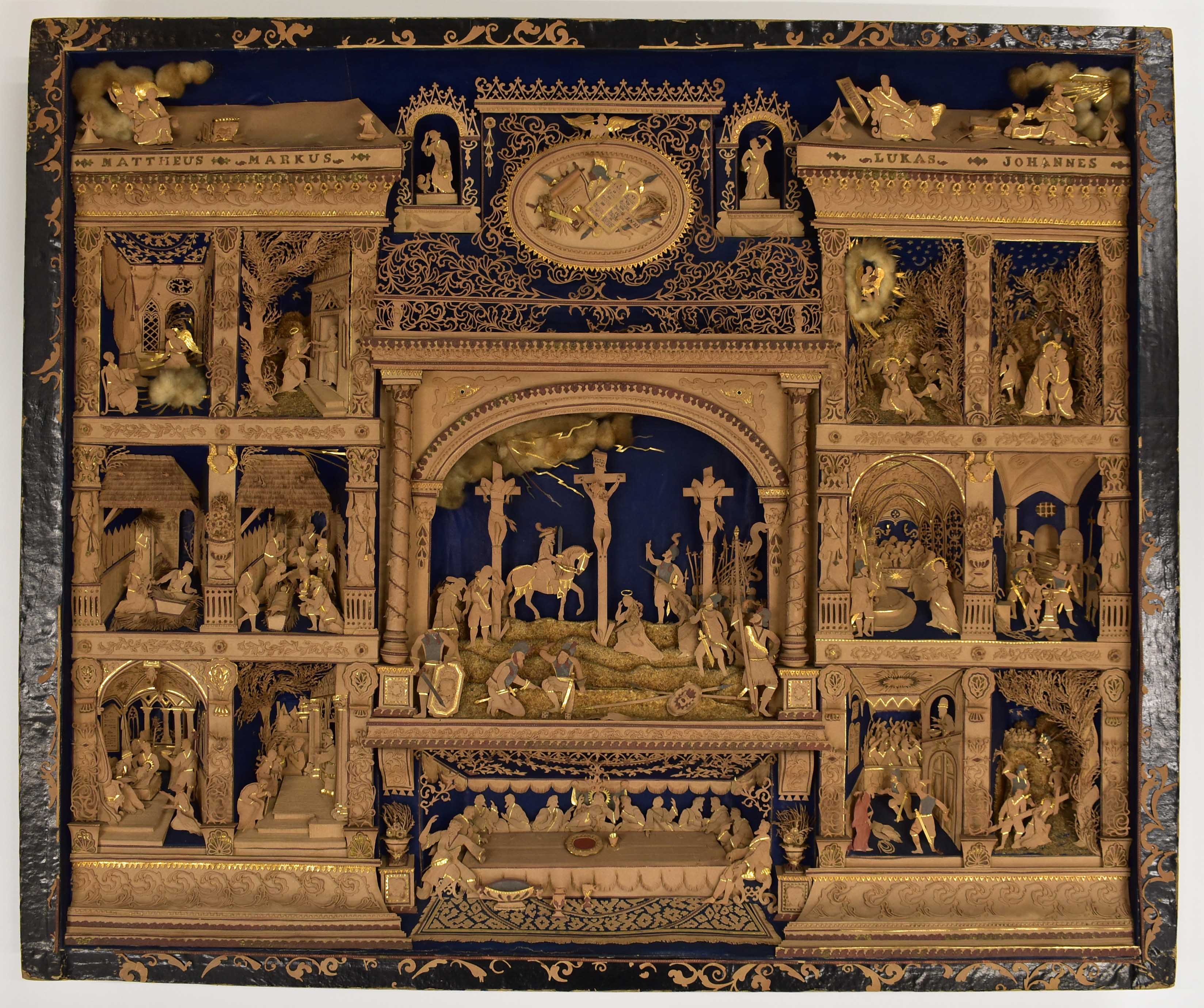 Knipwerk met veertien voorstellingen uit het leven van Jezus, centraal de kruisiging