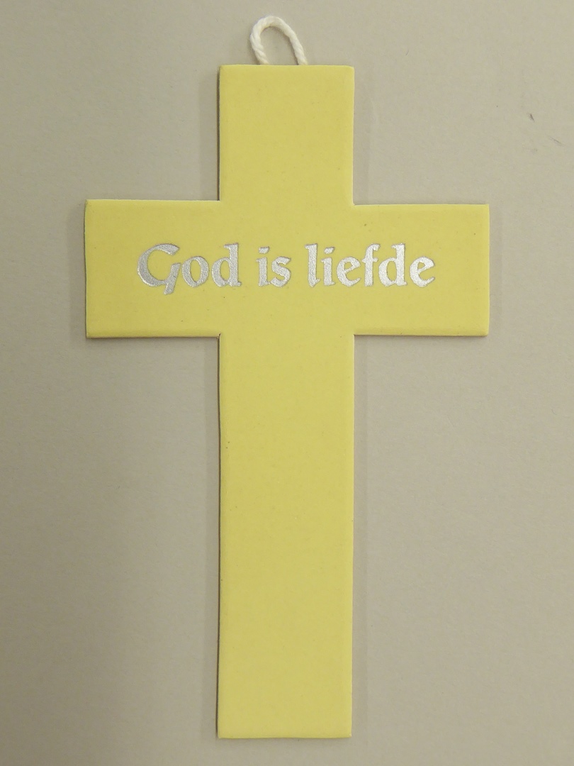 Geel fluorescerend kruis met "God is liefde"