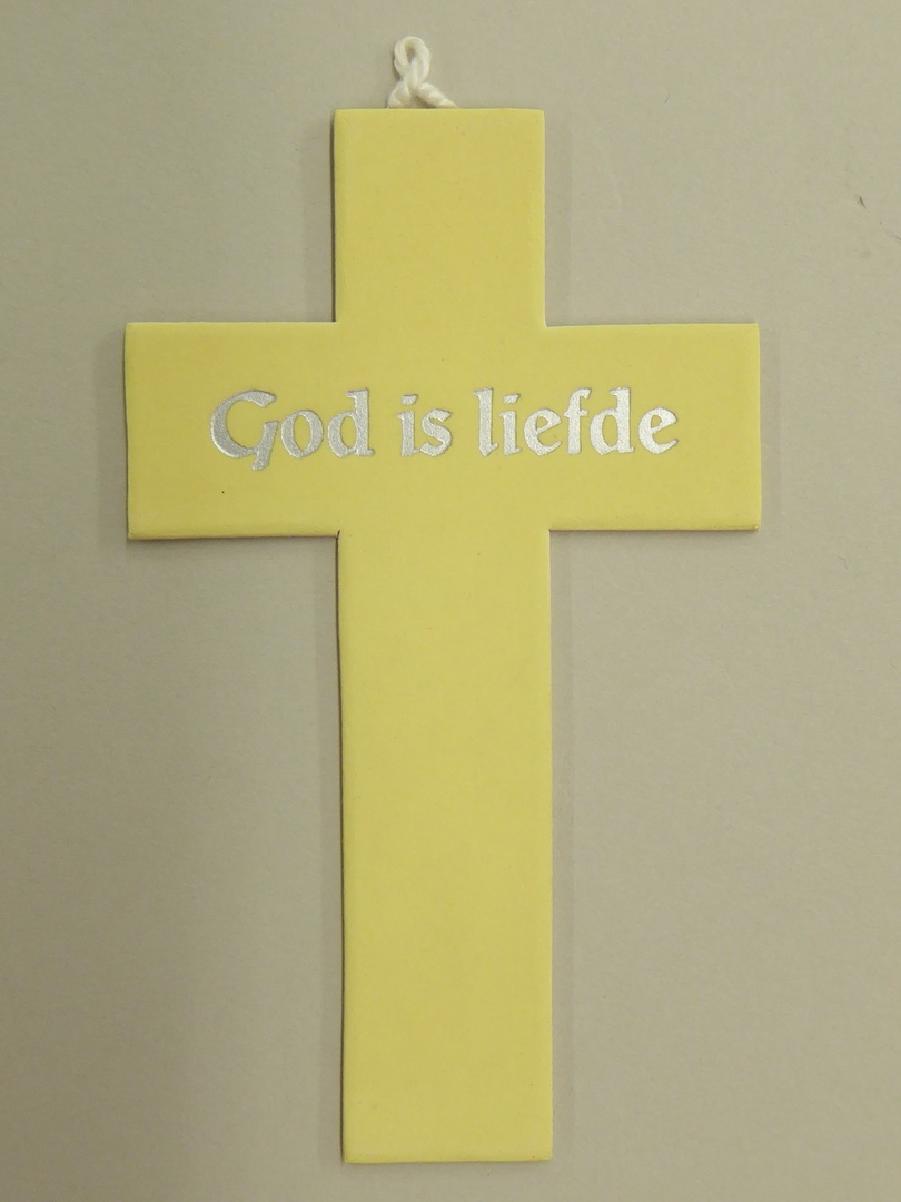 Geel fluorescerend kruis met "God is liefde"