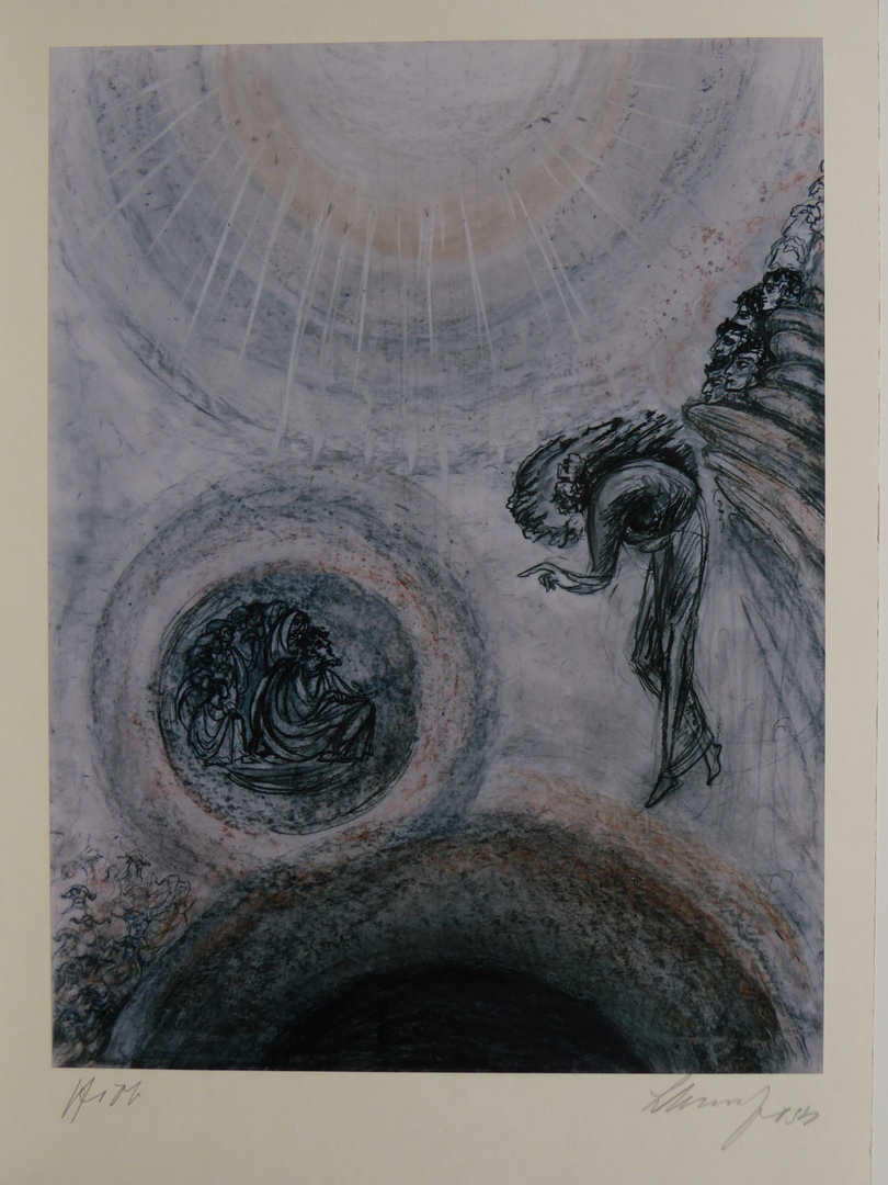 Kleurenfoto (V) van tekening: Job ontvangt de onheilstijdingen (Job 1:13), in omslag