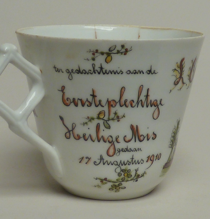 Kop met kerk en "... Eerste plechtige Heilige Mis gedaan 17 Augustus 1910 van L.C. v.d. Nouweland..."