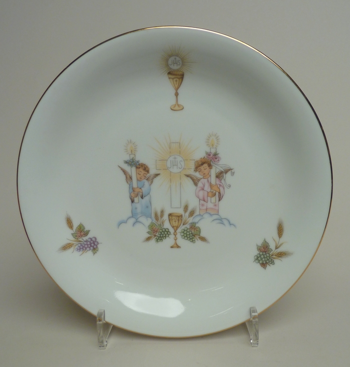 Ontbijtbord van communieservies met lichtend kruis met hostie en twee kaarsen dragende engeltjes