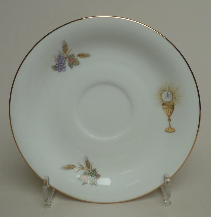 Schotel van communieservies met kelk en stralende hostie en twee maal druiventrossen met korenaren