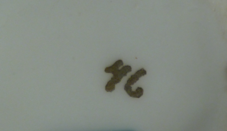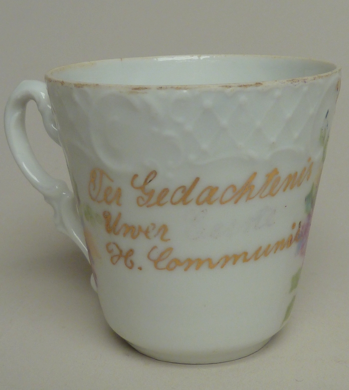 Kopje met "Ter Gedachtenis Uwer ... H. Communie" en gouden kruis met in blauw stralende hostie