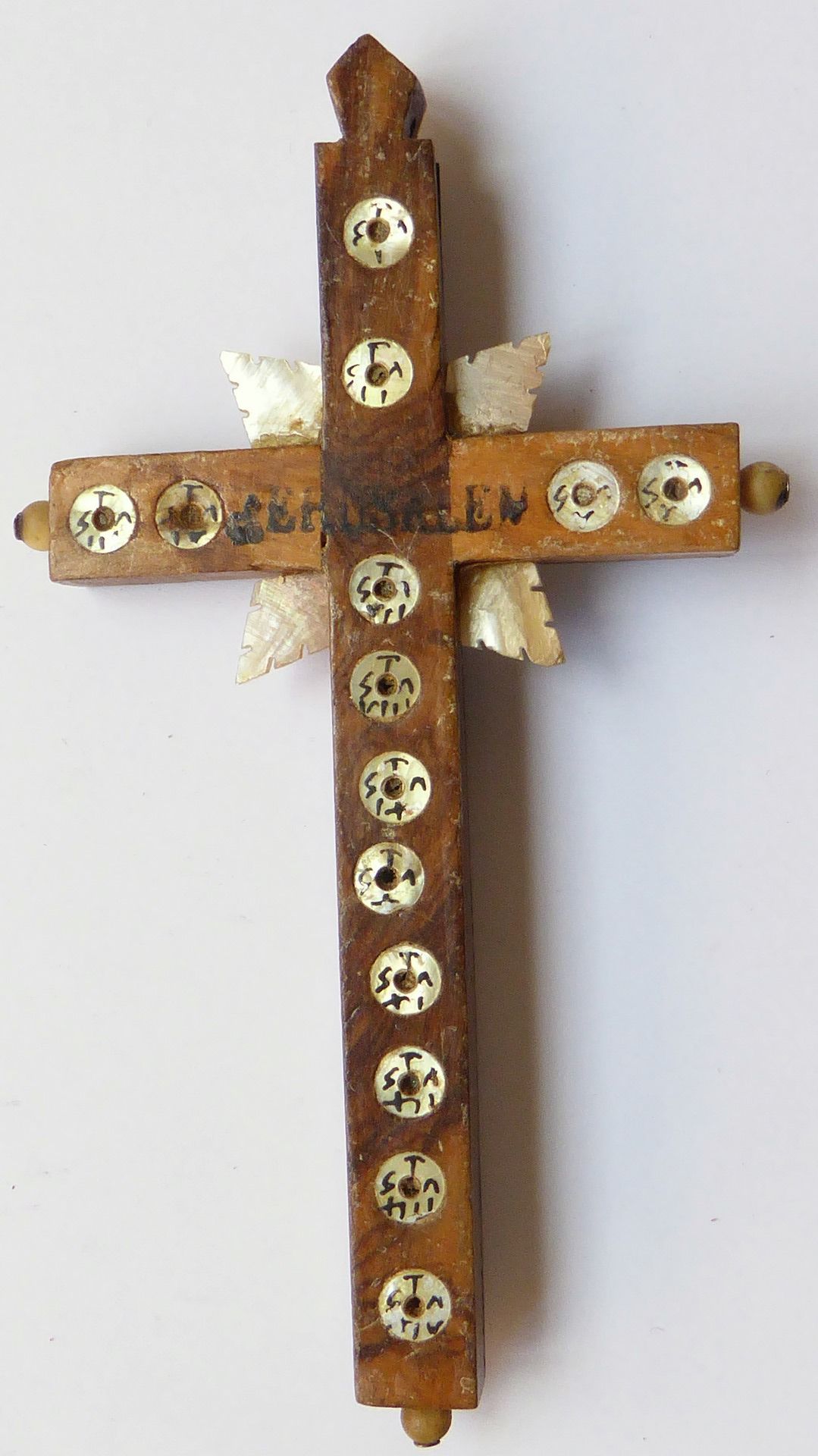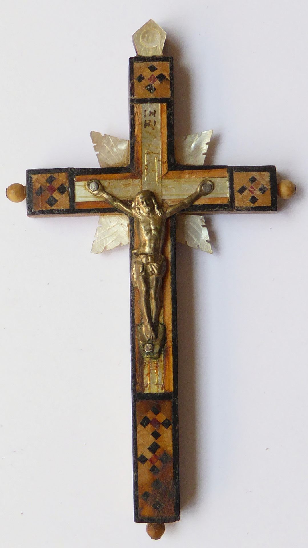 Kruis ingelegd met parelmoer met koperen corpus, kz. veertien parelmoeren schijfjes, kruiswegstaties