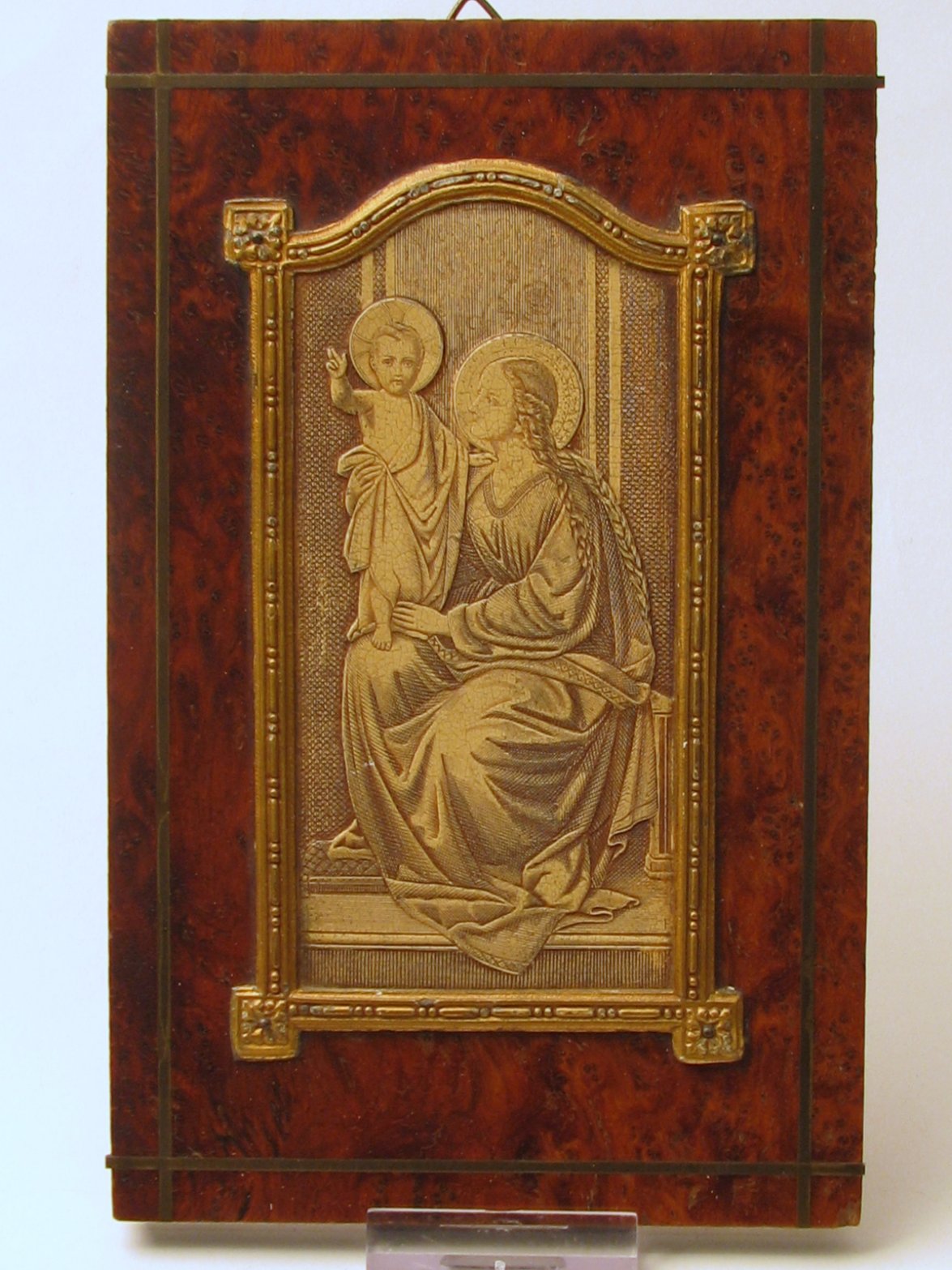 Wandversiering met een relief van Maria met kindje Jezus op een mahoniehouten plankje