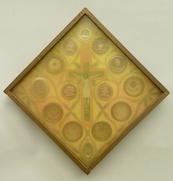 Ruitvormige reliekhouder met veertien reliekmedaillons rond Christus aan het kruis