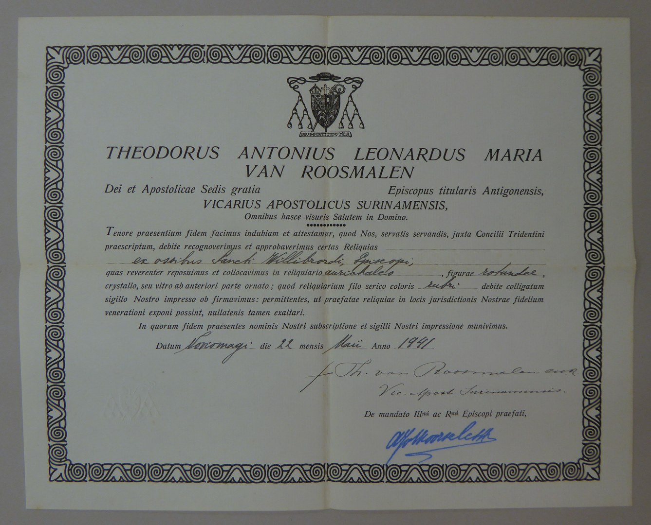 Echtheidsverklaring bij reliek H. Willibrord in RMCC v762a met "Theodorus ... van Roosmalen ..."