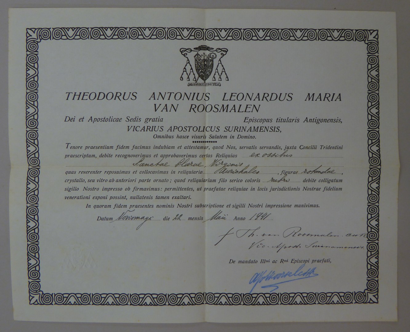 Echtheidsverklaring bij reliek H. Clara in RMCC v762a met "Theodorus ... van Roosmalen ..."