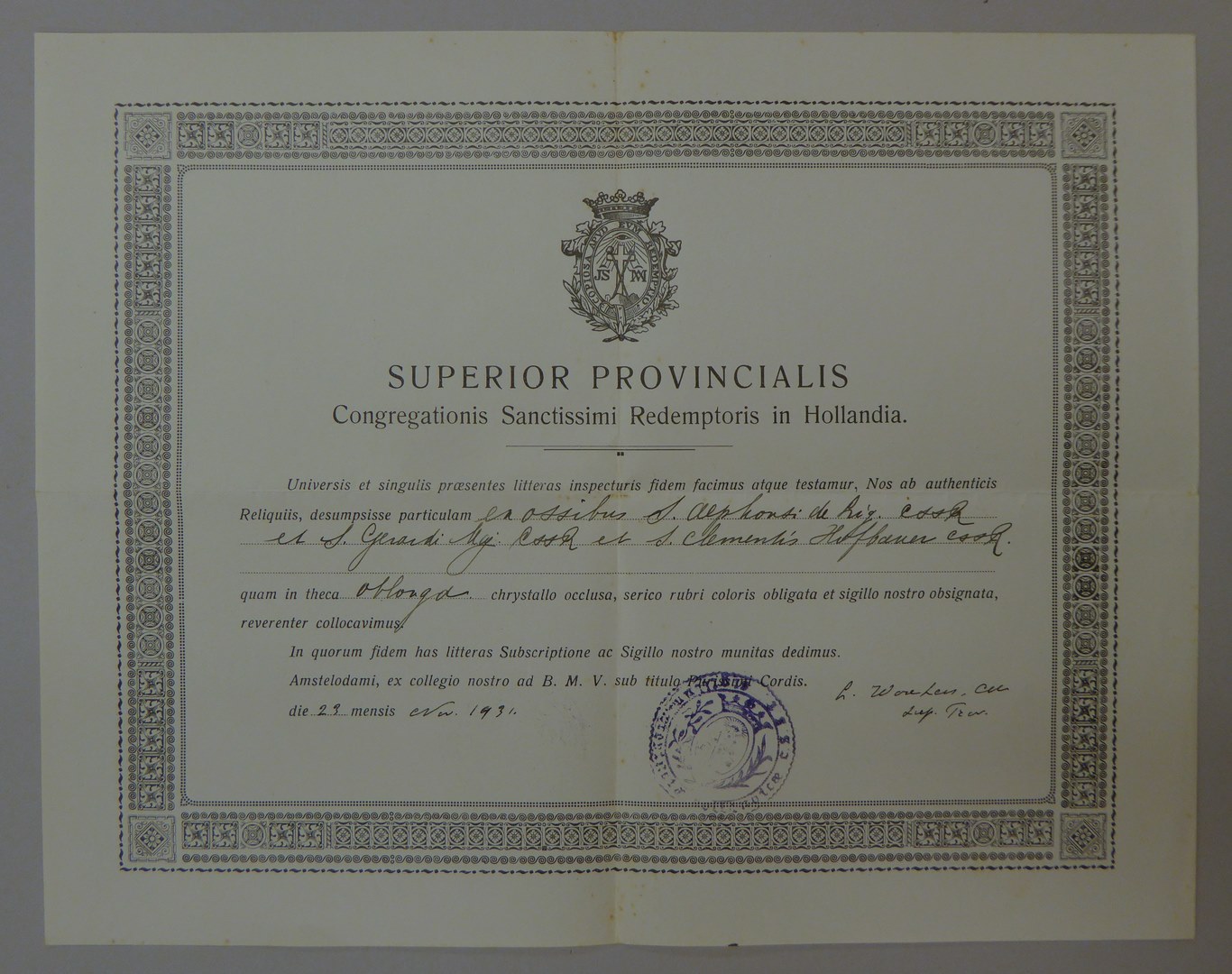Echtheidsverklaring bij reliek van o.a. H. Alphonsus de Liguori in RMCC v762a
