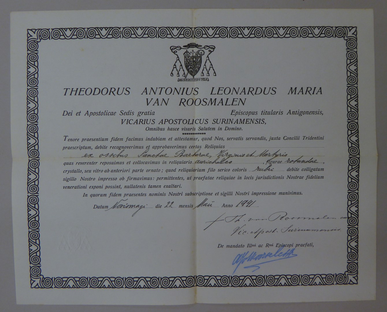 Echtheidsverklaring bij reliek H. Barabara in RMCC v762a met "Theodorus ... van Roosmalen ..."