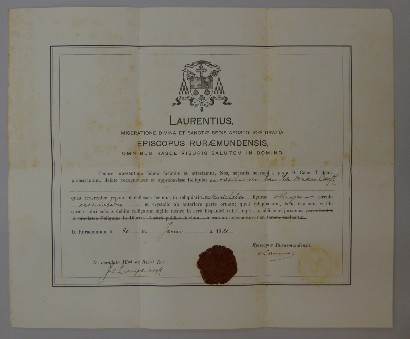 Echtheidsverklaring bij reliek H. Petrus Donders in RMCC v762a met "Laurentius (Schrijnen) ..."