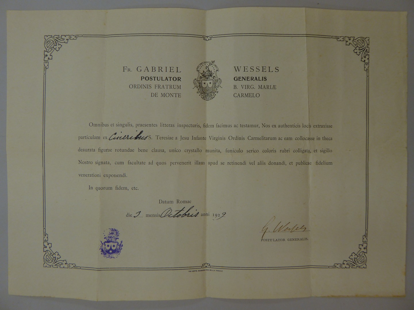 Echtheidsverklaring bij reliek H. Theresia in RMCC v762a met "Fr. Gabriel Wessels ..."