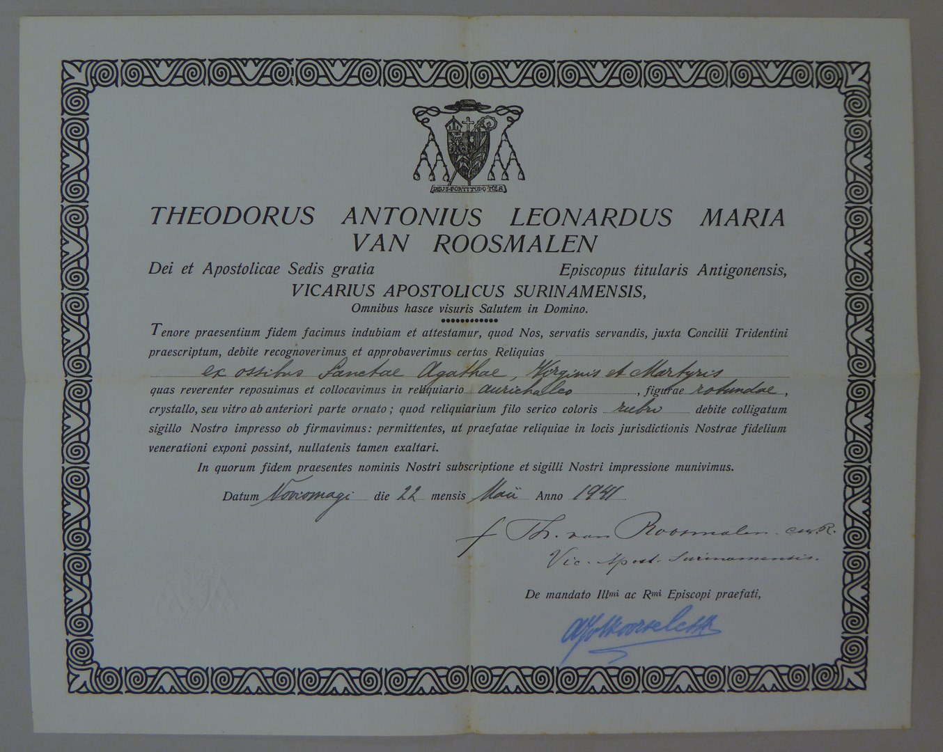 Echtheidsverklaring bij reliek H. Agatha in RMCC v762a met "Theodorus ... van Roosmalen ..."