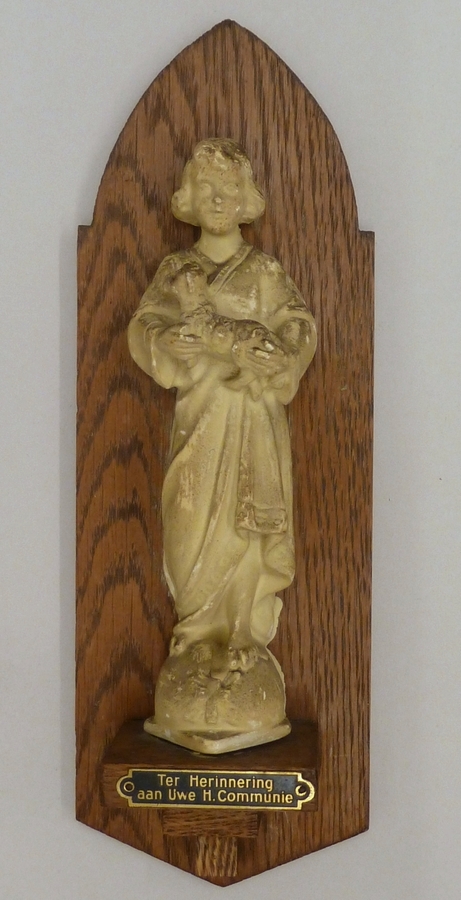 Christuskind met lam op arm op sokkel met "Ter Herinnering aan Uwe H. Communie"