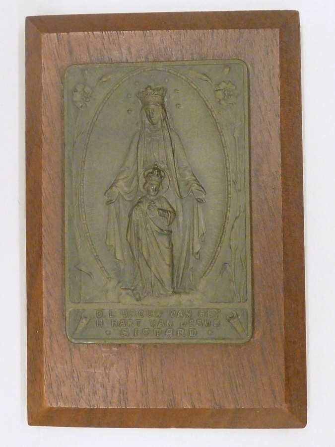 Plaquette op houten plaatje met "O.L. Vrouw van het H. Hart van Jesus, Sittard"