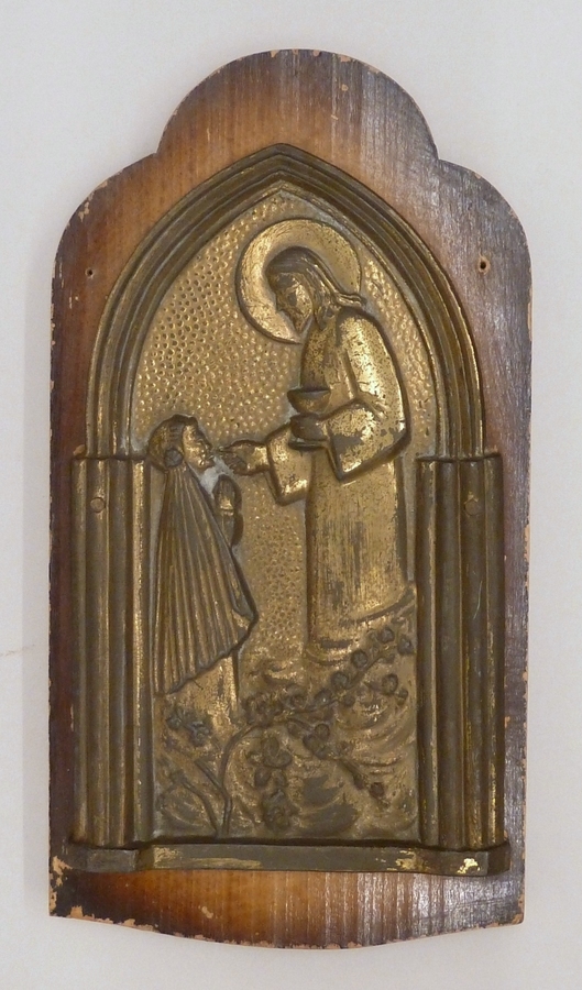 Plaquette op houten plaatje met afbeelding van Jezus die de communie uitreikt