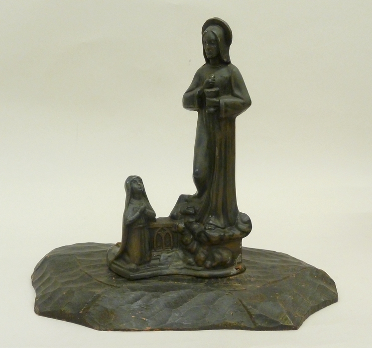 Knielende vrouw voor Christus met kelk en hostie, staande op een rots