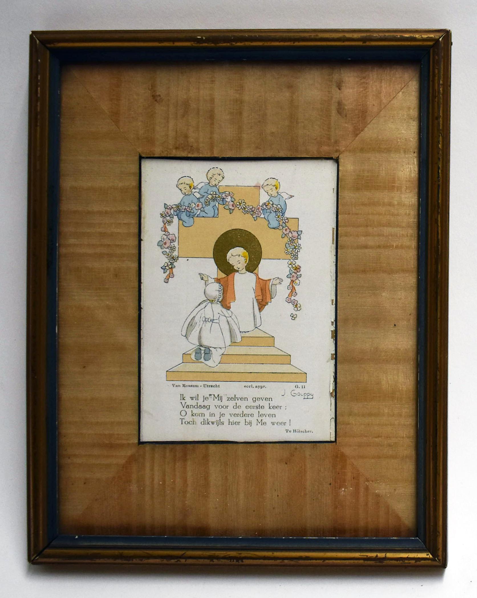 Knielend meisje voor zegenend Christuskind met gedichtje achter glas als eerste communiegeschenk