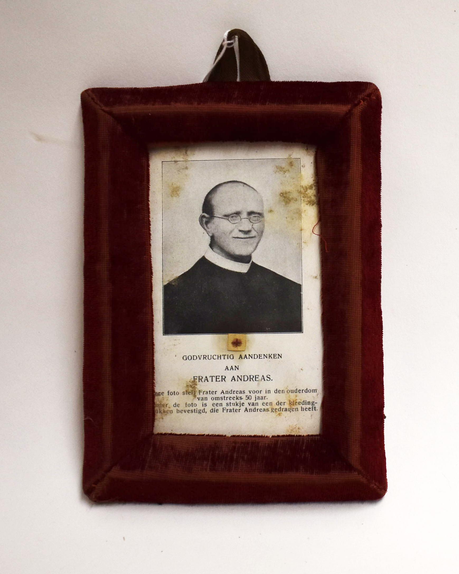 Aandenken aan frater Andreas met zijn foto en stukje van zijn kleding