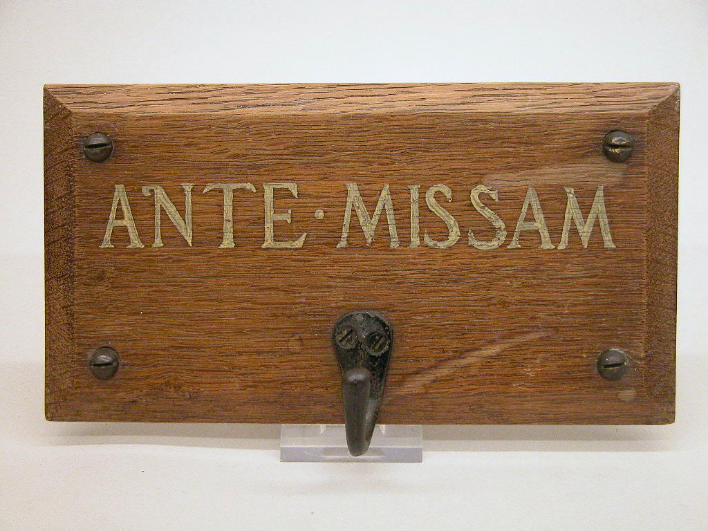 Handdoekhaak op plankje voor de handdoek bij rituele handwassingen voor de mis met "Ante Missam"