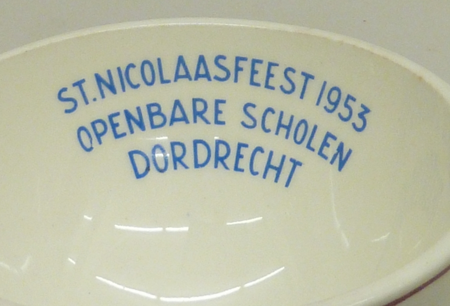 Boerenbonte beker met "St. Nicolaasfeest 1953 Openbare scholen Dordrecht"