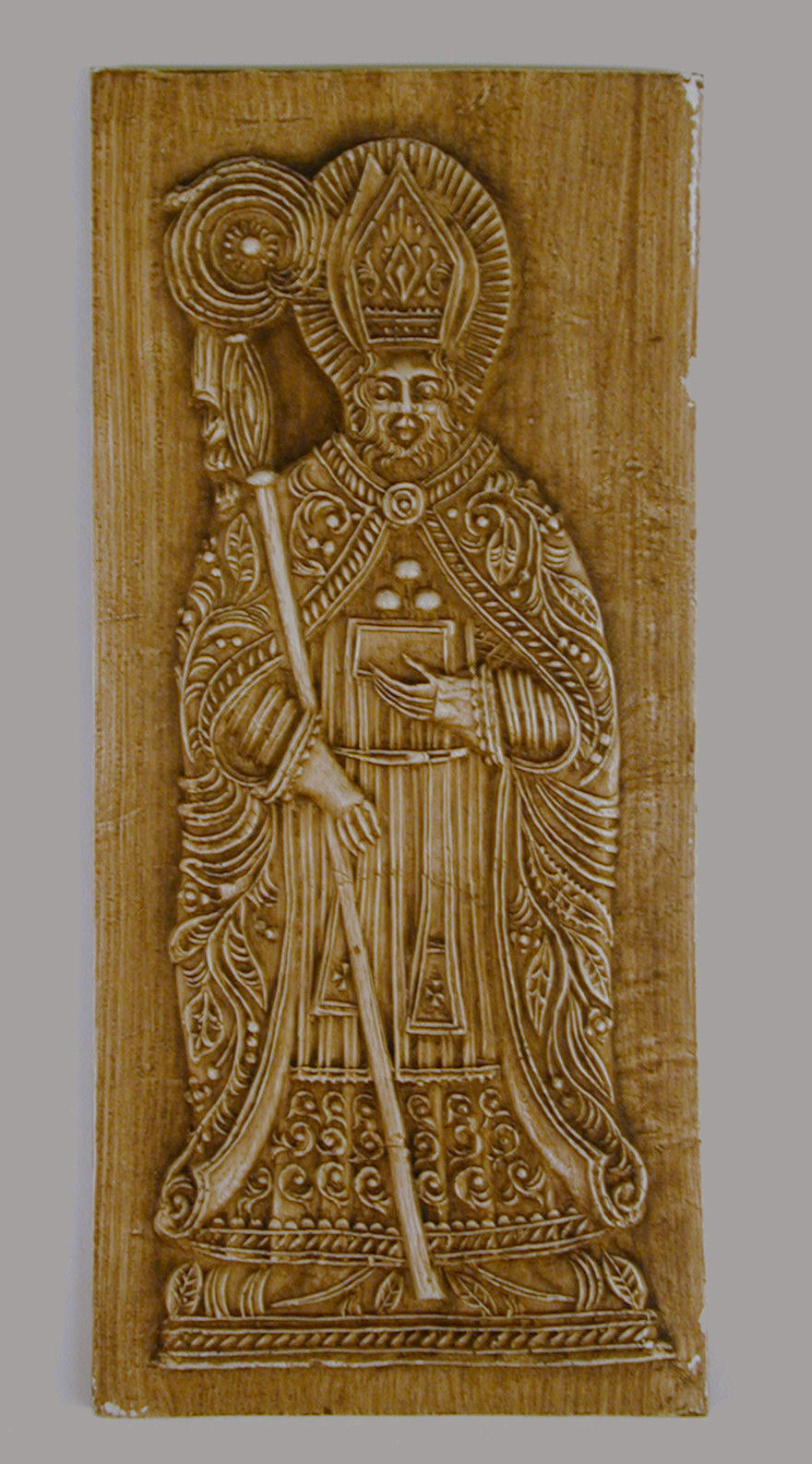 Afgietsel van een reliëf van Sint Nicolaas met staf en boek met drie bollen