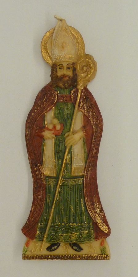 Gepolychromeerd reliëf in was van Sint Nicolaas met staf en drie ballen op boek en met "I B H"