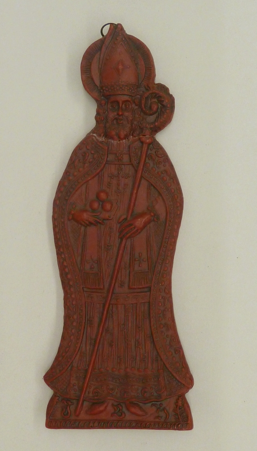 Reliëf in rode was van Sint Nicolaas met staf en boek met drie ballen en met "I B H"