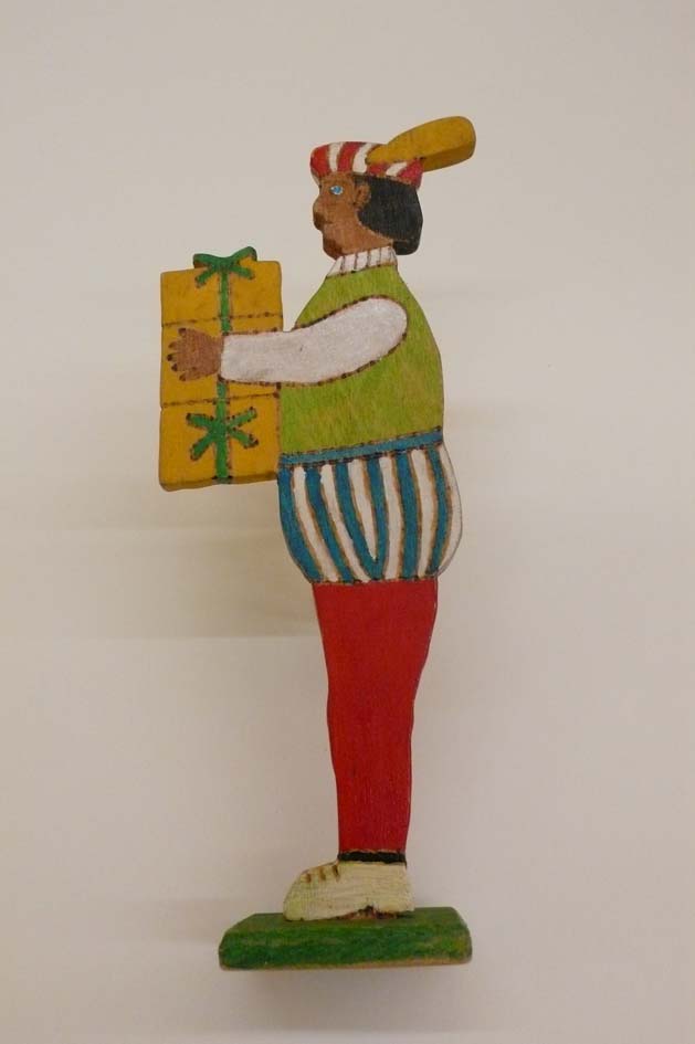 Gefiguurzaagde Zwarte Piet met pakje in de handen