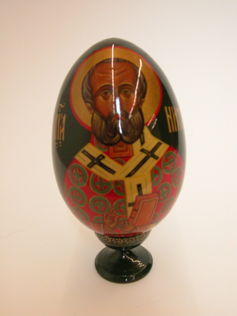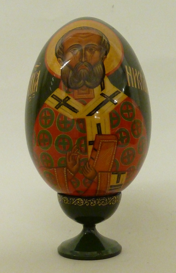 Houten ei op eierdop met Sint Nicolaas en engel op achterzijde tegen donkergroene achtergrond