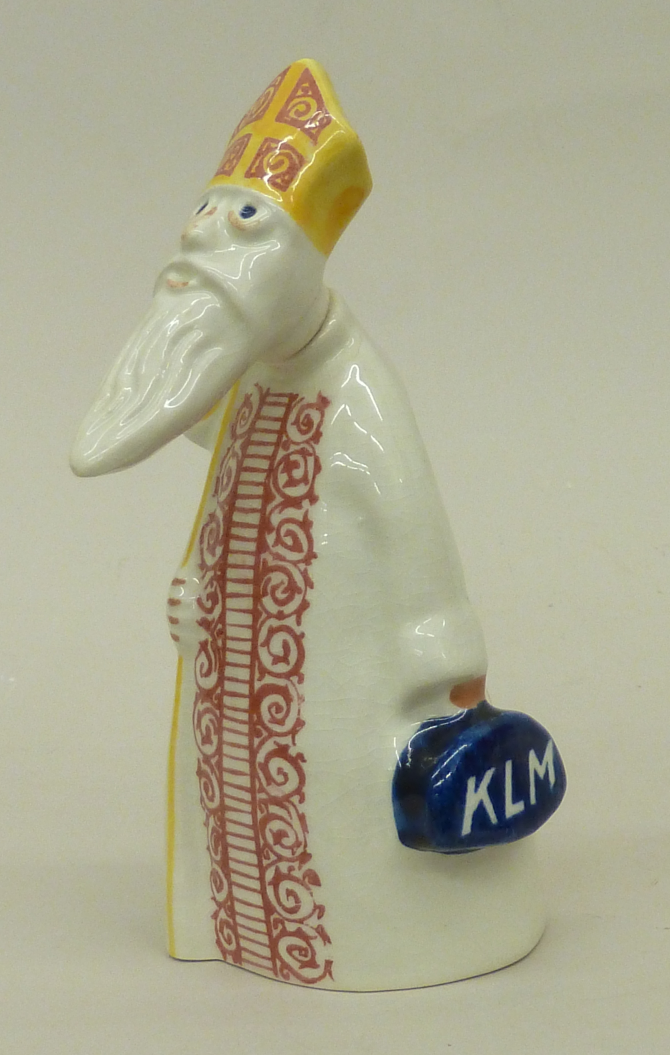Jeneverkruik in vorm van Sint Nicolaas met K.L.M. koffer in linkerhand, hoofd met mijter als dop