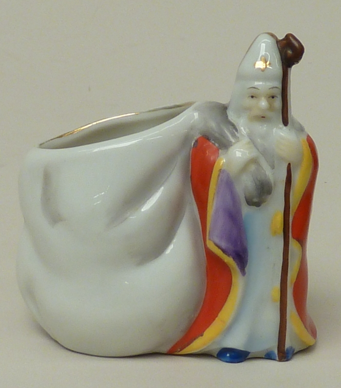 Houder voor chocoladesigaretten(?) in de vorm van een zak door Sint Nicolaas gedragen