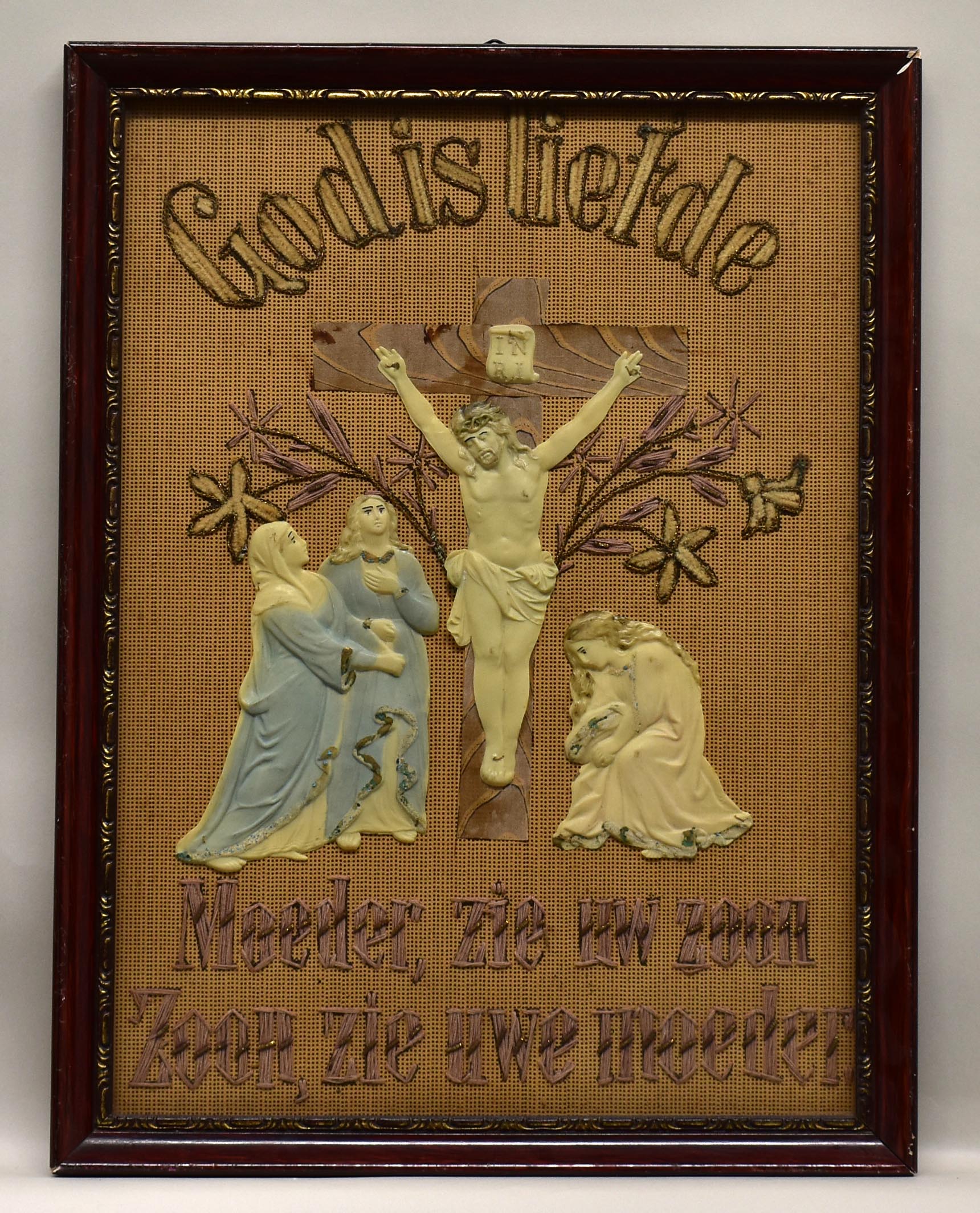 Tekstbord met kruisiging en "God is liefde", "Moeder, zie uw Zoon", "Zoon, zie uwe moeder"