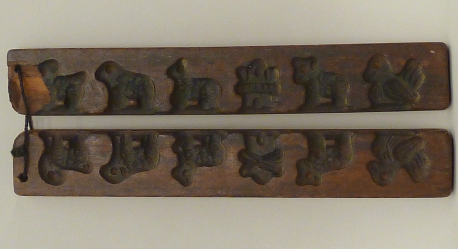 Suikergoedvorm(?) in twee helften met vijf dieren en molen