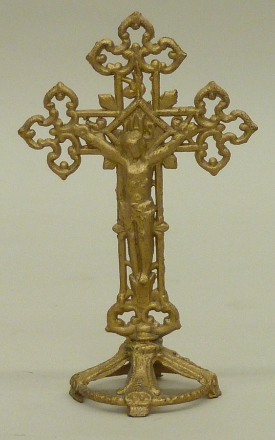 Goudkleurig speelgoedaltaarkruis op ronde opengewerkte voet
