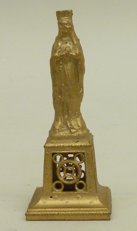 Goudkleurig Mariabeeldje op hoge opengewerkte voet