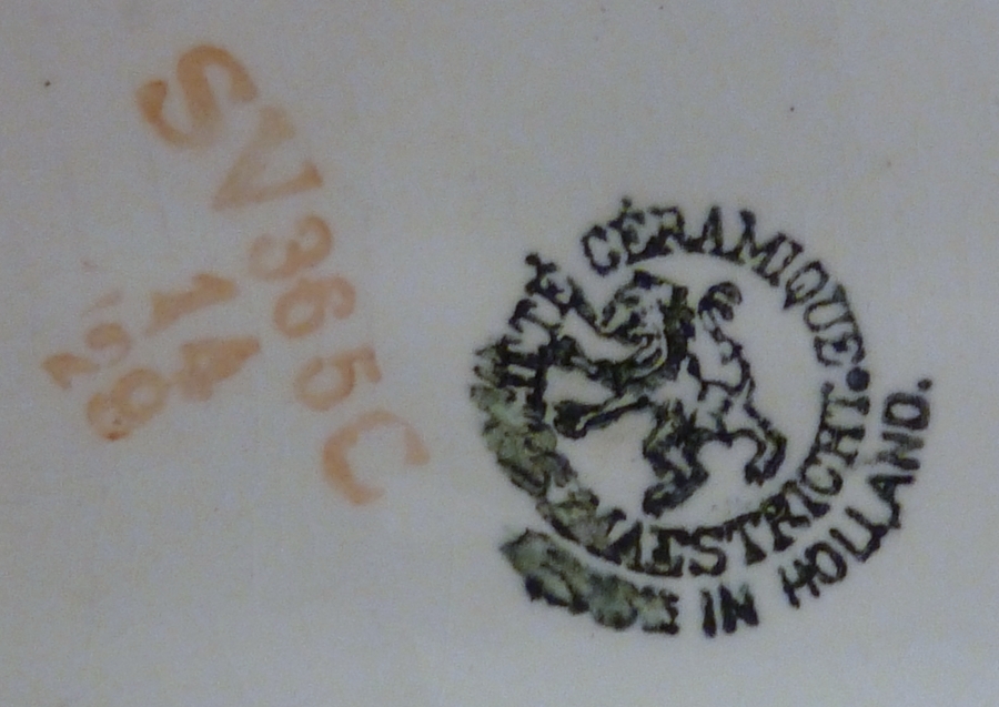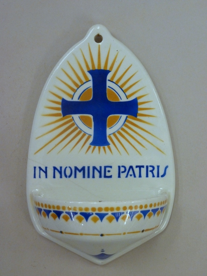 Wit wijwaterbakje met blauw kruis en "In nomine Patris" op achterwand